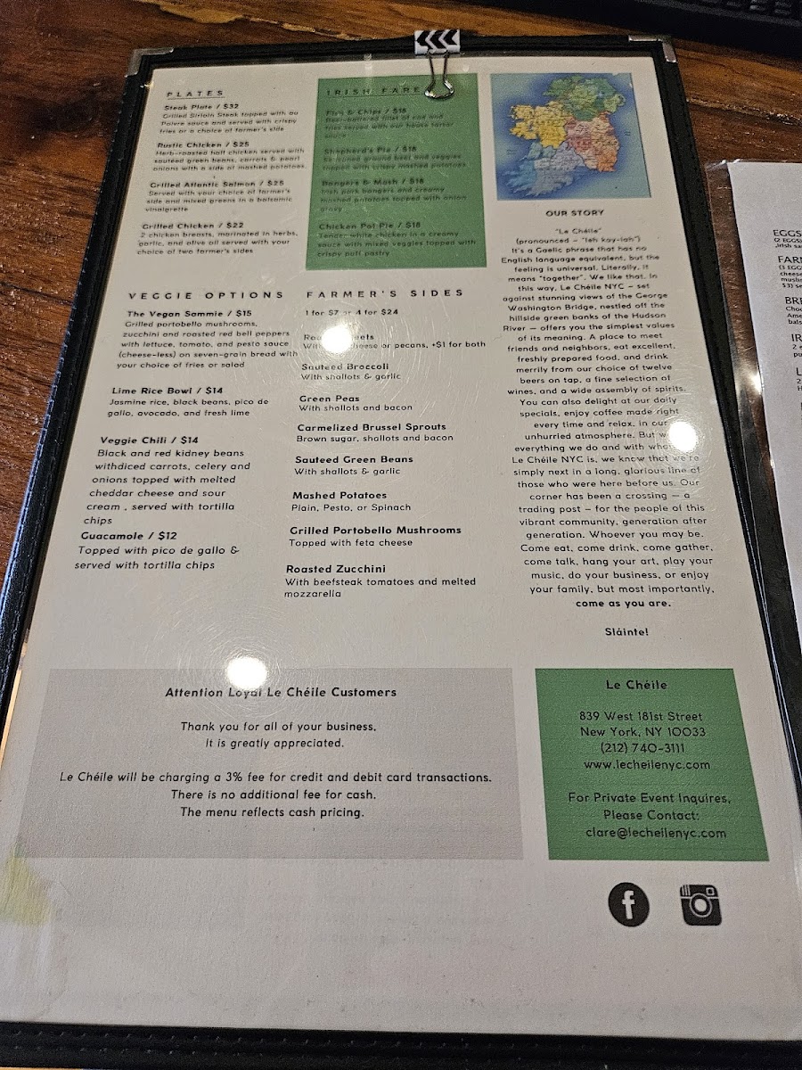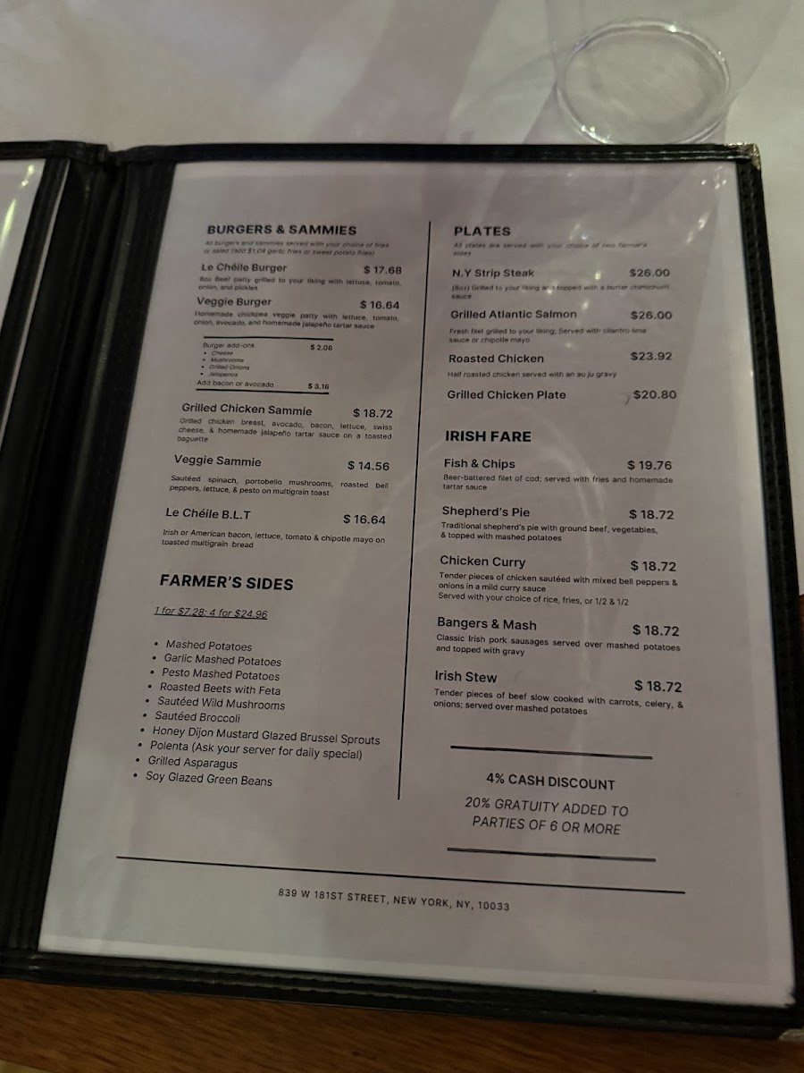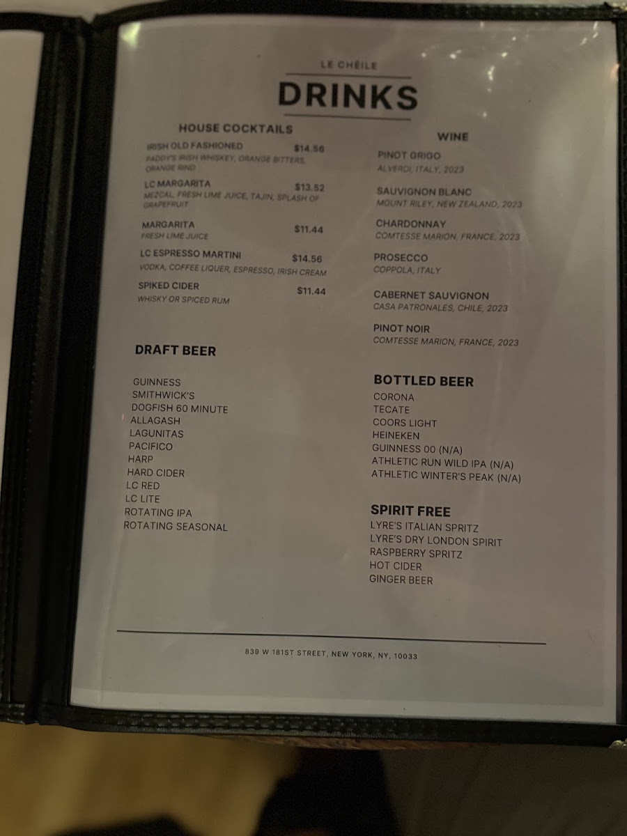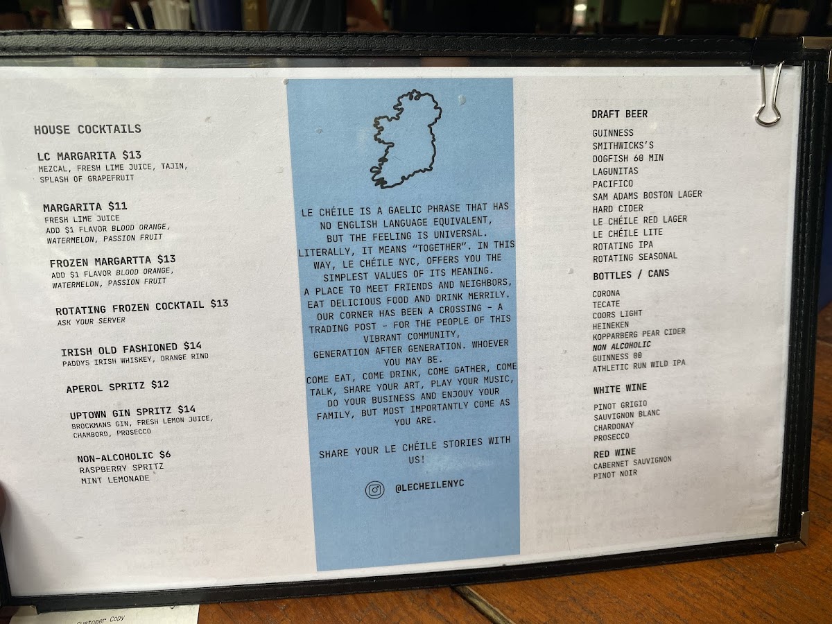 The relaxed, old-world vibe of Le Chéile naturally encourages casual conversations and lingered moments, with the menu’s approachable flavors fitting seamlessly into the background of a cozy neighborhood gathering spot near the George Washington Bridge.